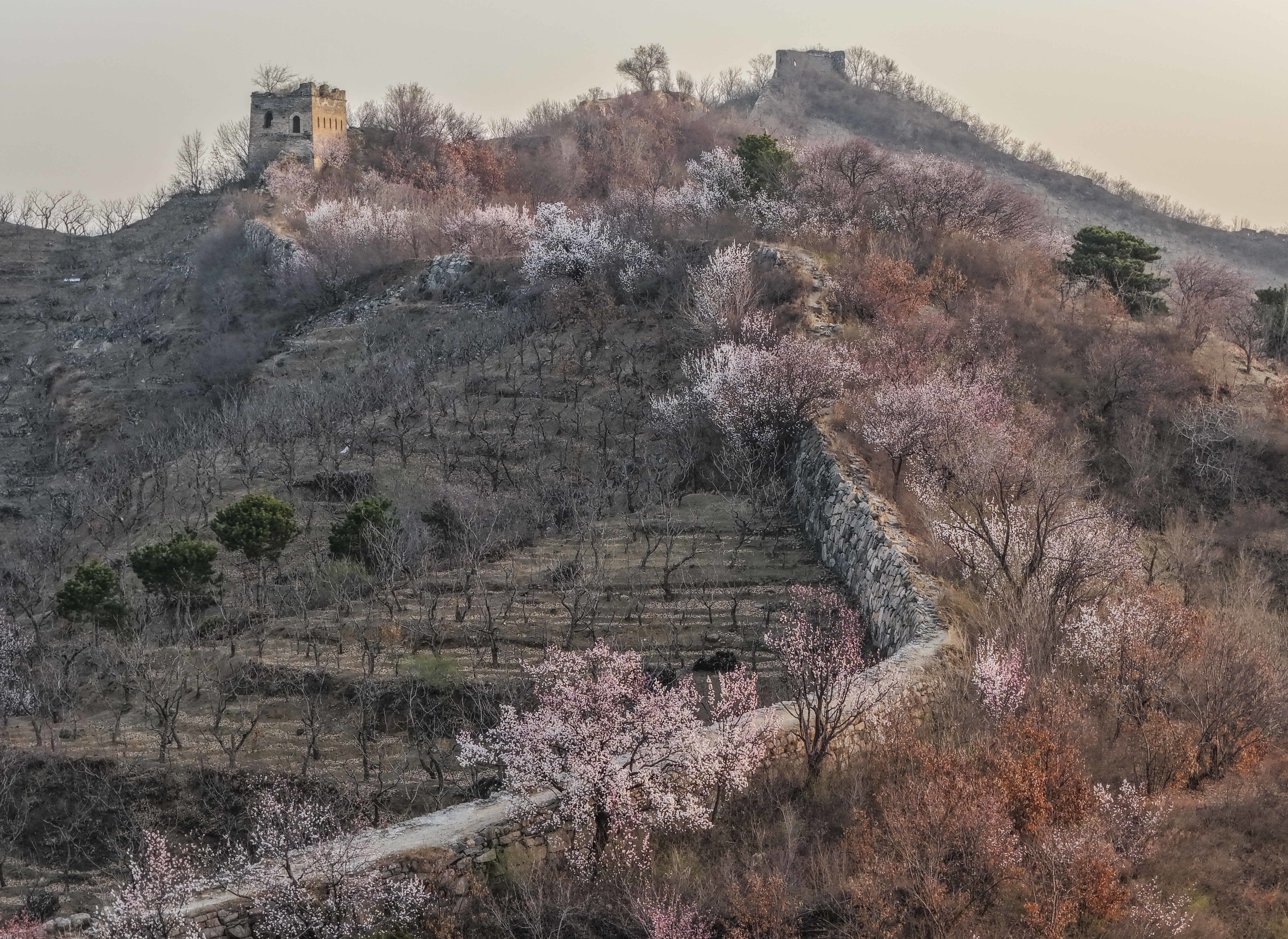 3月28日,河北省遵化市境内的古长城隔邻山花绽开(无东谈主机相片)。