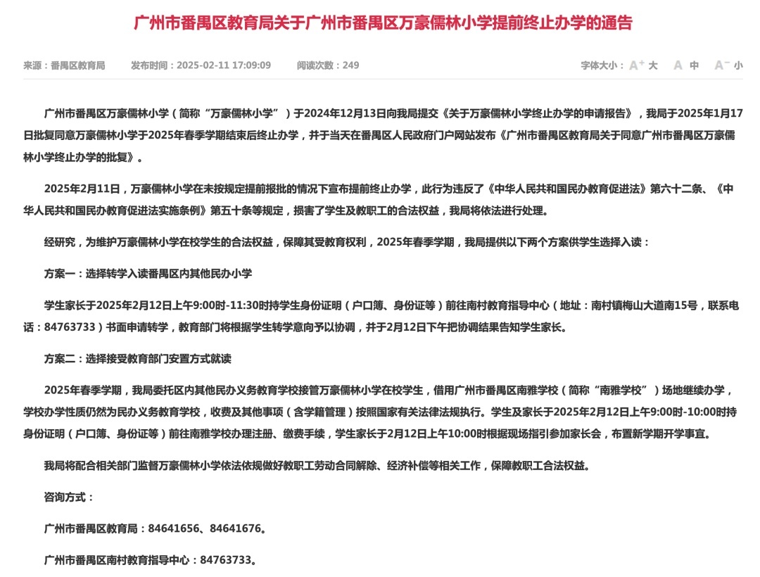 2025年2月11日,万豪儒林小学在未按章程提前报批的情况下宣布提前隔绝办学,此活动违犯了《中华东谈主民共和国民办教练促进法》第六十二条、《中华东谈主民共和国民办教练促进法实施条例》第五十条等章程,挫伤了学生及教员工的正当权益,番禺区教练局将照章进行处理。