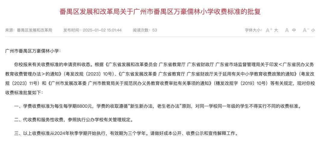 1月2日,番禺区发展和改造局发布了《对于广州市番禺区万豪儒林小学收费尺度的批复》,笔据相关章程,对万豪儒林小学收费尺度批复如下:膏火收费尺度为每生每学期8800元,膏火的收取投诚“重生新目的,须生老目的”原则,对并吞学校并吞年龄的学生不得实行不同的收费尺度;代收费和服务性收费,参照奉行公办学校相关处置章程;以上收费尺度从2024年秋季学期启动奉行,有用期为三个学年。广州市番禺区发展和改造局要肆业校作念好老本公开、收费公示和宣传解释责任。