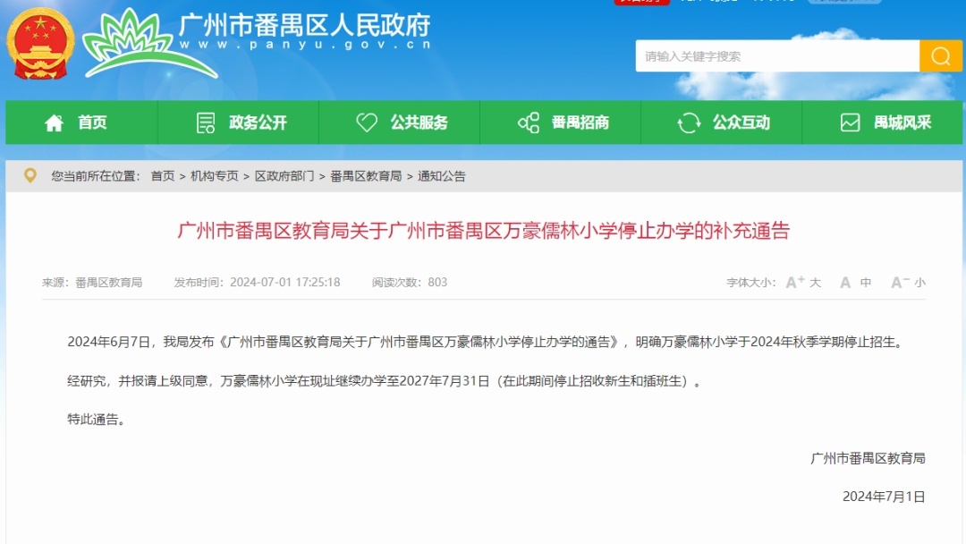 2024年7月1日,广州市番禺区教练局发布对于广州市番禺区万豪儒林小学住手办学的补充告示称,经研究,并报请上司首肯,万豪儒林小学在现址陆续办学至2027年7月31日(在此技能住手招收重生和插班生)。