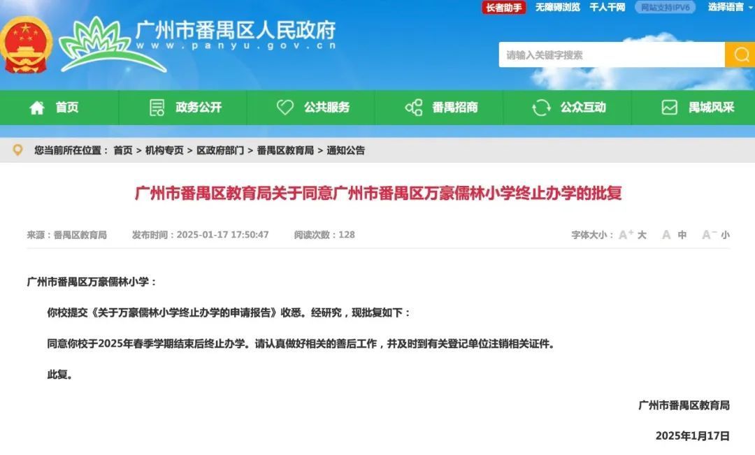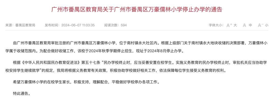 2024年6月7日,广州市番禺区教练局发通知示称,由广州市番禺区教练局审批注册的广州市番禺区万豪儒林小学,位于南村镇永大社区内。笔据上司部门对于南村镇永地面块收储的决策部署,万豪儒林小学属于收储限度内。为配合作念好收储责任,该校将于2024年秋季学期住手招生,现址将于2024年8月住手办学。
