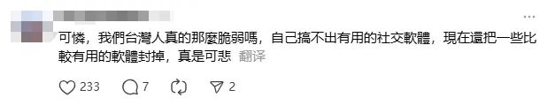 对此,有台湾网友嘲讽示意,我方搞不出有效的酬酢软件,当今还把一些比拟有效的软件封掉,确凿可悲!“到底在发怵什么?”