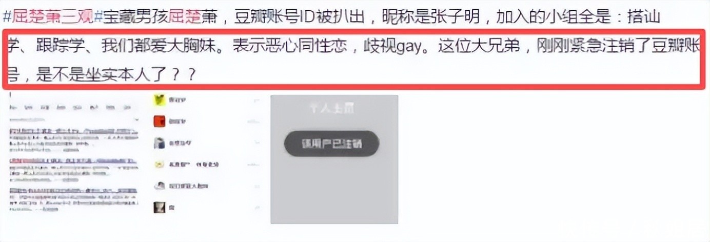 2019年,有网友扒出屈楚萧用“张子明”的豆瓣账号为《流浪地球》评分。