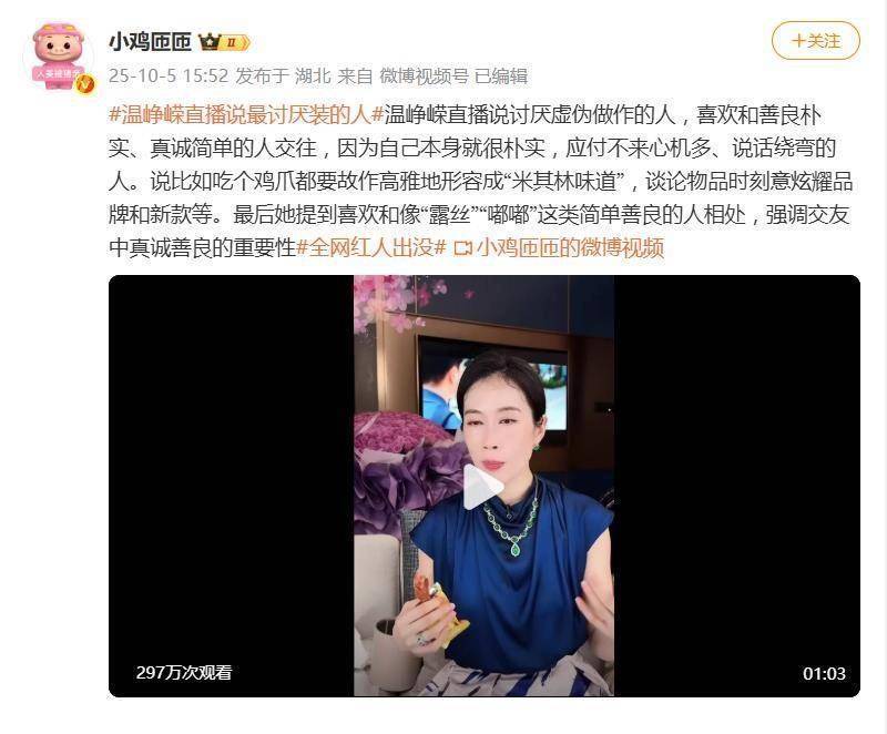 直播中,温峥嵘绝不见原地批判两类活动:一是硬把平庸鸡爪包装成“米其林滋味”的矫强刻画,二是聊天时分意强调糟践品牌、新款,甚而通过责怪他东谈主物品来秀优胜的操作。她直言这类不实作念派“消费元气心灵”,我方秉性朴实径直,“应答不来神思多、话语绕弯的东谈主”。相背,她偏疼与暖热朴实、古道浅近的东谈主来往,更点名玩赏赵露念念(露丝)和陈齐灵(嘟嘟)这类艺东谈主。