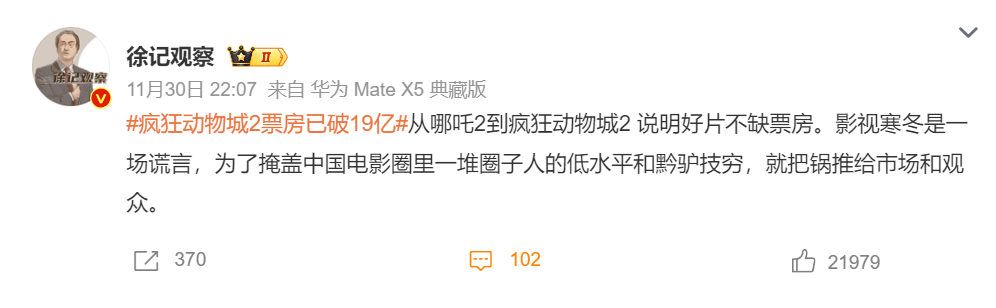影视隆冬是一场坏话,为了秘籍中国电影圈里一堆圈子东谈主的低水祥和悲观失望,就把锅推给市集和不雅众。