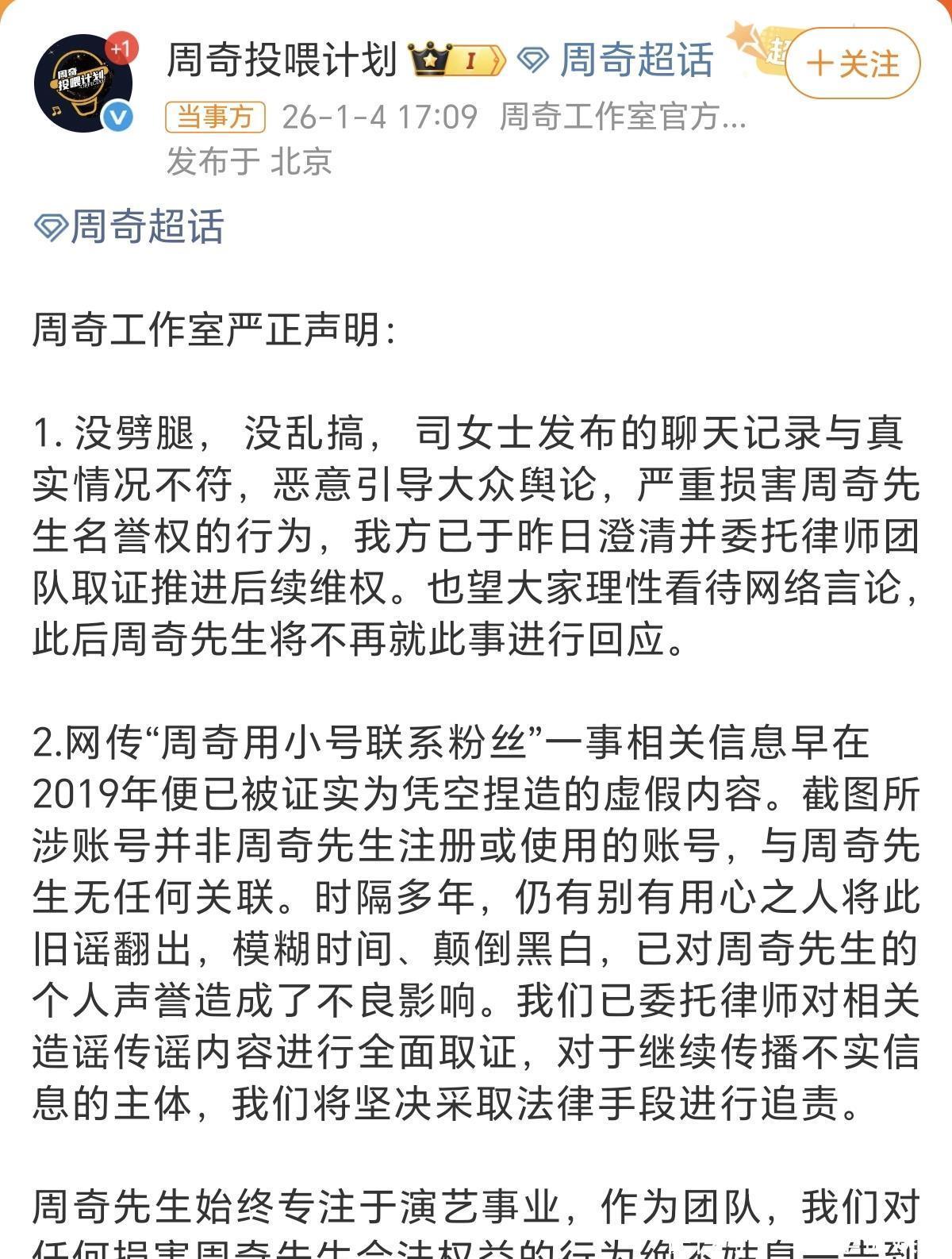 声明中明确否定周奇劈叉乱搞,称司晓迪发布的聊天纪录与果真情况不符,同期也否定周奇用小号有关粉丝。