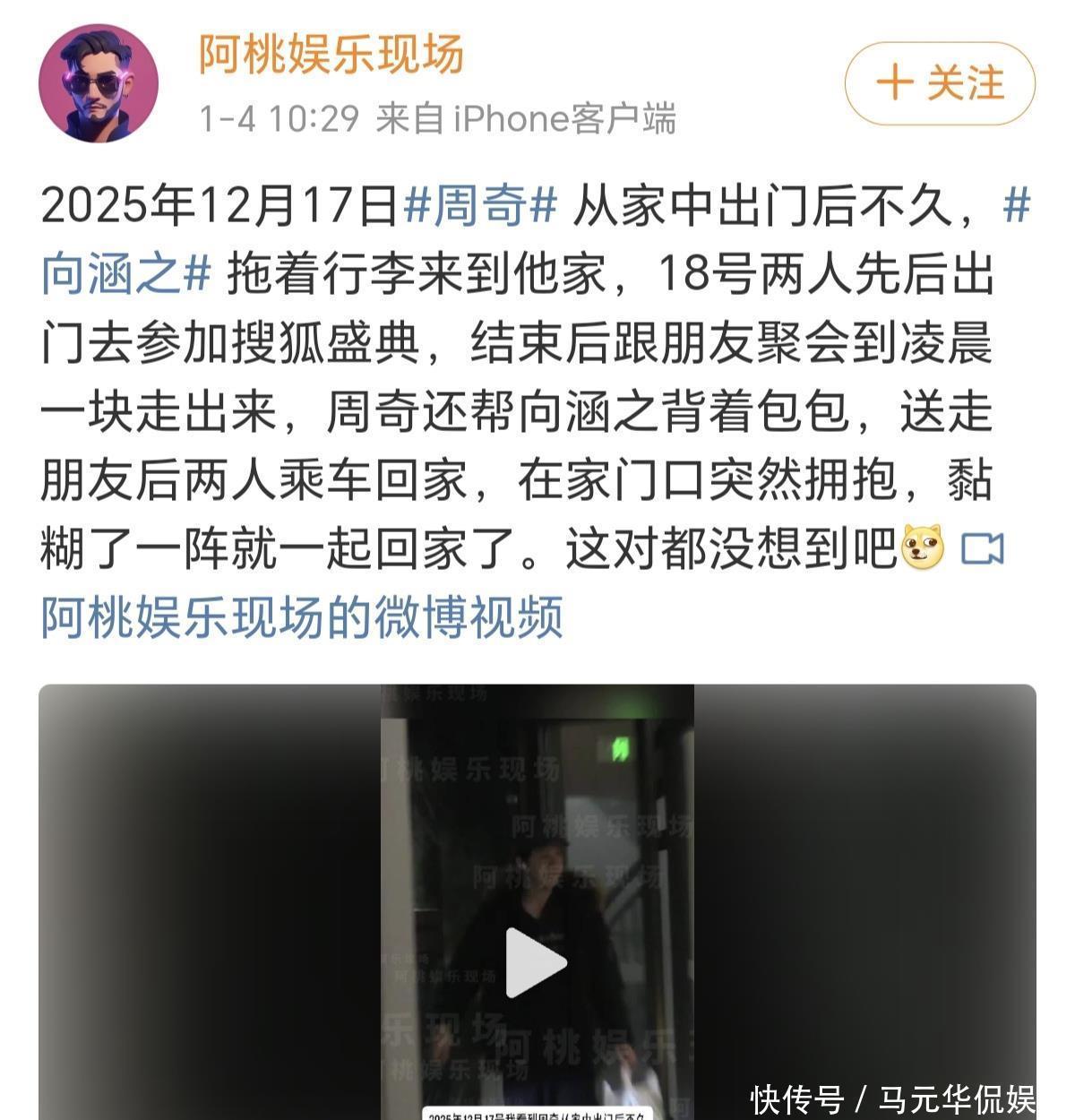 2025年12月17日,向涵之拖着行李箱参预周奇北京住所,被解读为“同居实锤”。