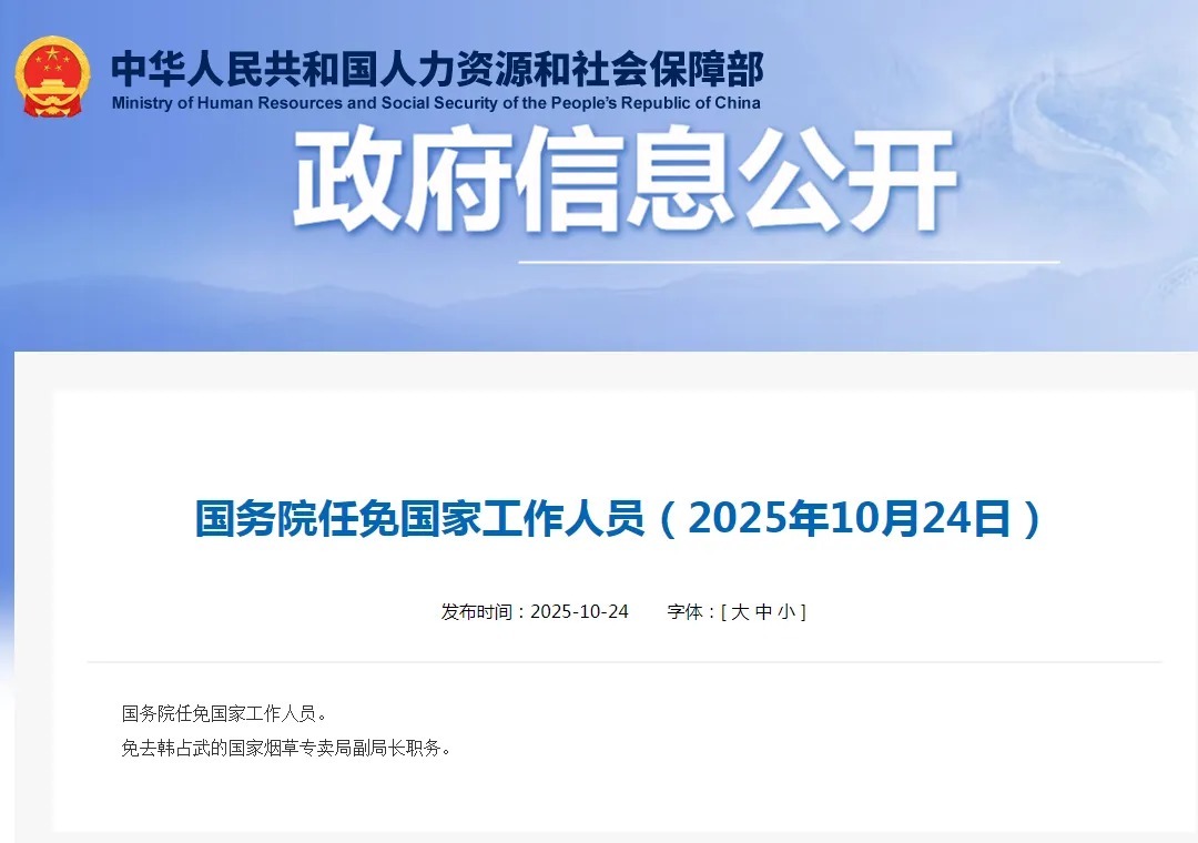 据东谈主力资源和社会保险部网站10月24日音信开云体育,国务院任免国度职责主谈主员:免去韩占武的国度香烟专卖局副局长职务。