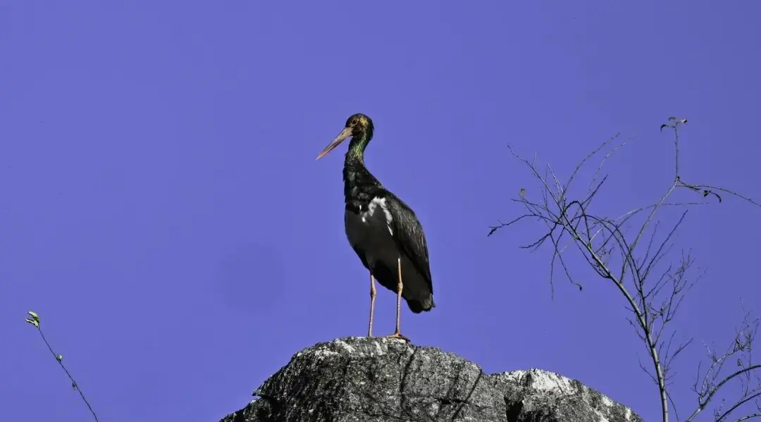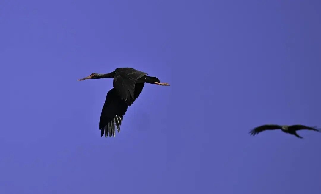 这只黑鹳成年个体特征彰着,躯壳大部分为带有金属明后的玄色,胸腹部纯碎如雪,喙和眼周皮肤呈现显然的鲜红色,体长目测逾越1米,合适黑鹳典型格局特征。
