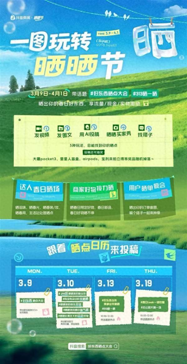 为助力春日消耗,3月9日,抖音电商崇拜上线“晒晒节”手脚,邀约平台用户、创作家与商家一同参与,激活优质实践生态,助力电商好物被更多东谈主看见,达成实践与买卖的双增长。参与者通过共享优质好物实践,即可有契机获取流量扶捏、现款奖励、精选好物、创作分红等多重激励。本次手脚将捏续至4月1日放浪。