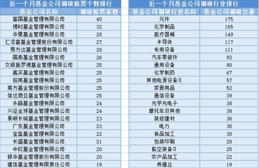 近一个月(2月21日-3月23日),富国基金参与公司调研的数目最多,共调研40家上市公司,此外调研较为活跃的还有博时基金、中原基金和汇添富基金,分辨调研32家、28家、27家上市公司;从调研行业上来看,基金公司对元件行业的上市公司调研次数最多,共有175次,其次是化学成品行业,基金公司调研了165次。